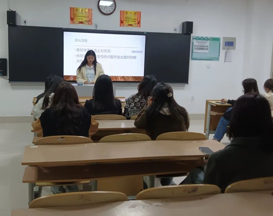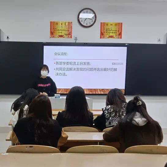 本次会议由学习部部长王晓薇主持,会议主要围绕开学以来各班学风情况进行讨论、反馈。会议开始,各班学委依次上台发言,主要阐述本班在上公共课以及晚自习时出现的问题,并针对各班实际情况,作出了详细的分析和解决方案。