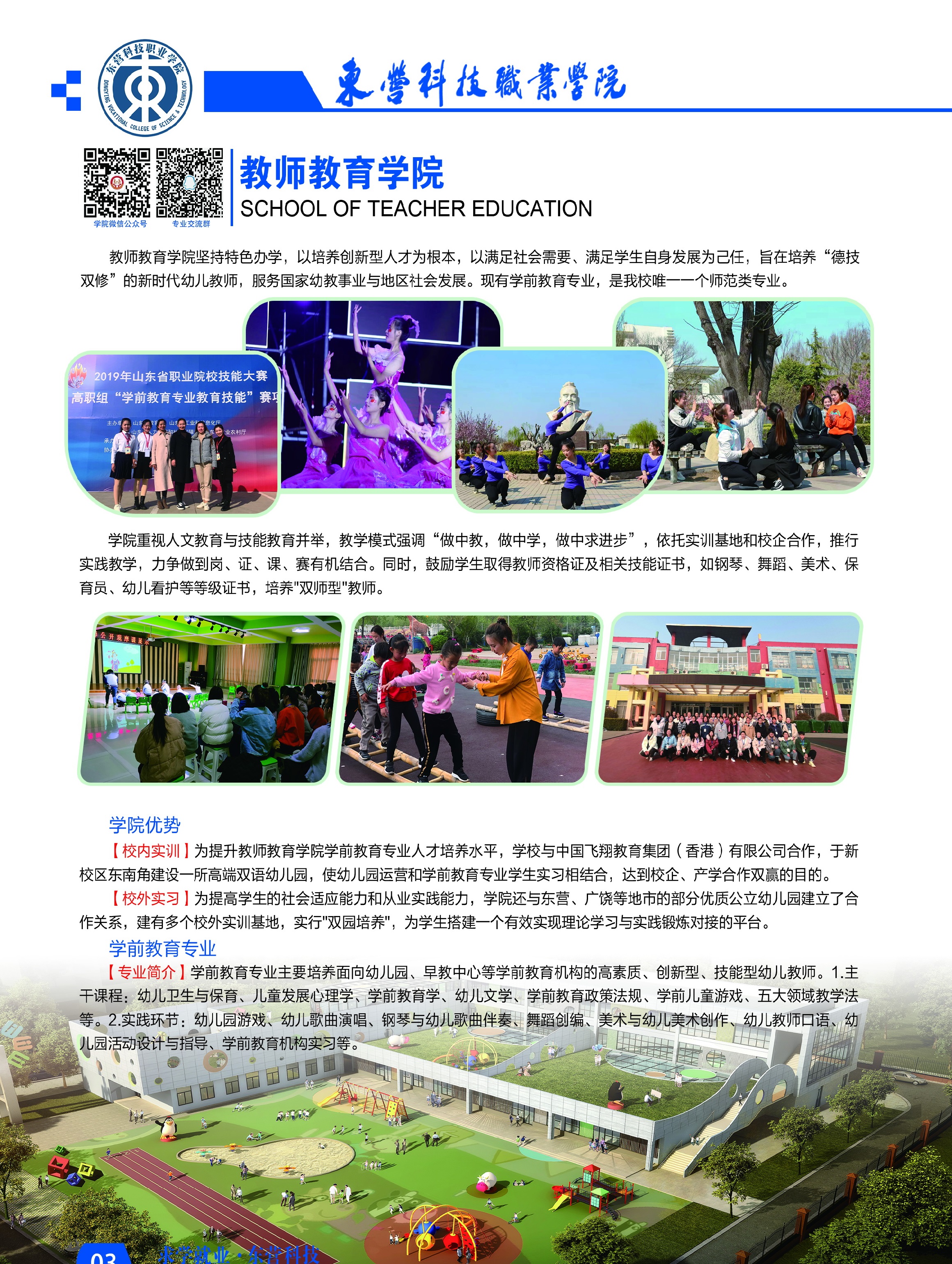 学院优势:1.校内实习:为提升必威BETWAY西汉姆联学前教育专业人才培养水平,学校与中国飞翔教育集团(香港)有限公司合作,于新校区东南角建设一所高端双语幼儿园,使幼儿园运营和学前教育专业学生实习相结合,达到校企、产学合作双赢的目的。2.校外实训:为提高学生的适应、实践能力,学院还与广饶、东营等地市的部分优质公立幼儿园建立了合作关系,建有多个校外实训基地,实行"双园培养",为学生搭建有效实现理论学习与实践锻炼对接的平台。