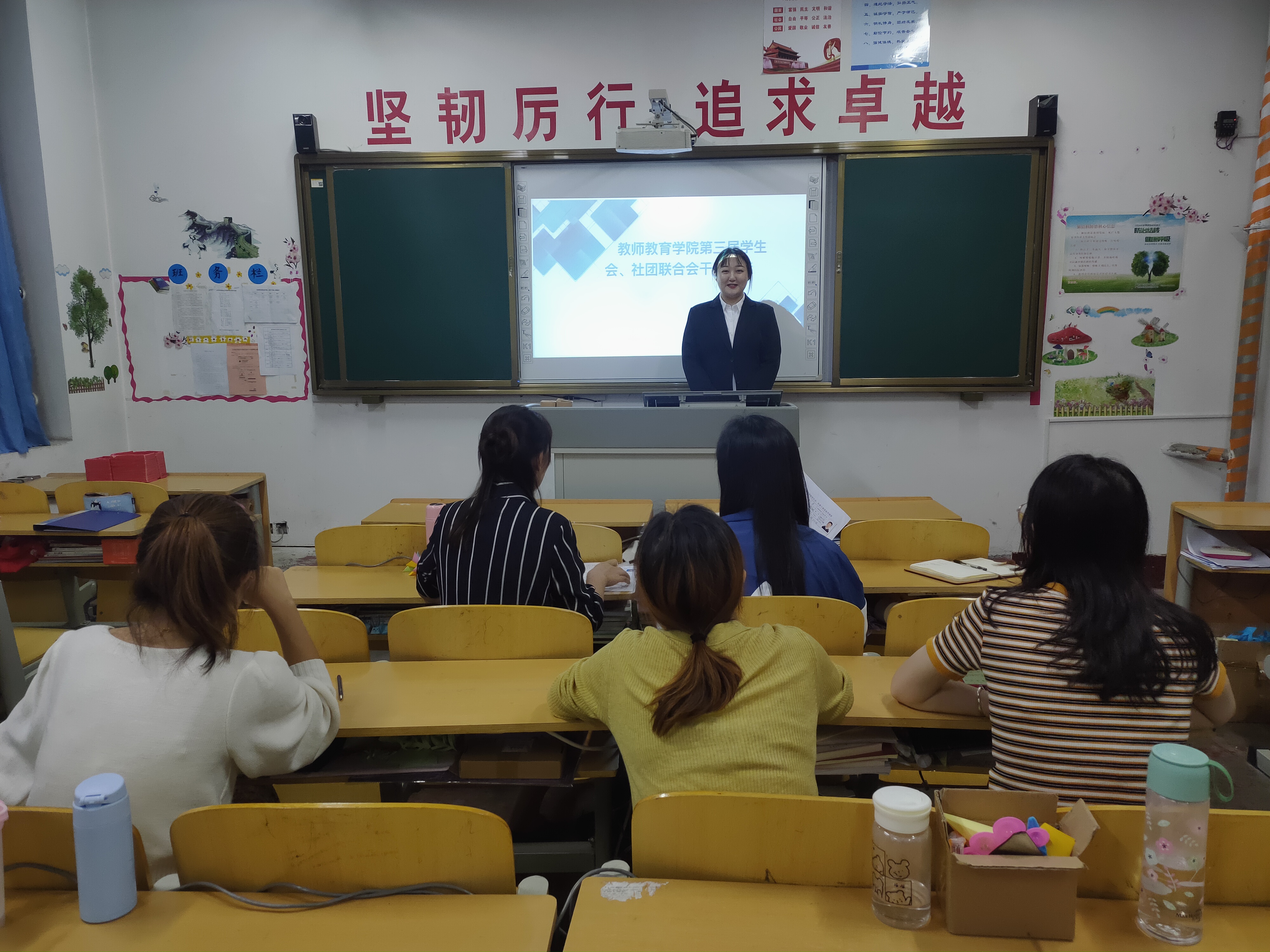 2020年9月23日,我院在一九学前教育六班举办了学生会部长竞选,社团联合会部长竞选,学生会各部门依次去主席台上进行讲话,全体参赛者井然有序,依次上台发挥出自己的洪荒之力。