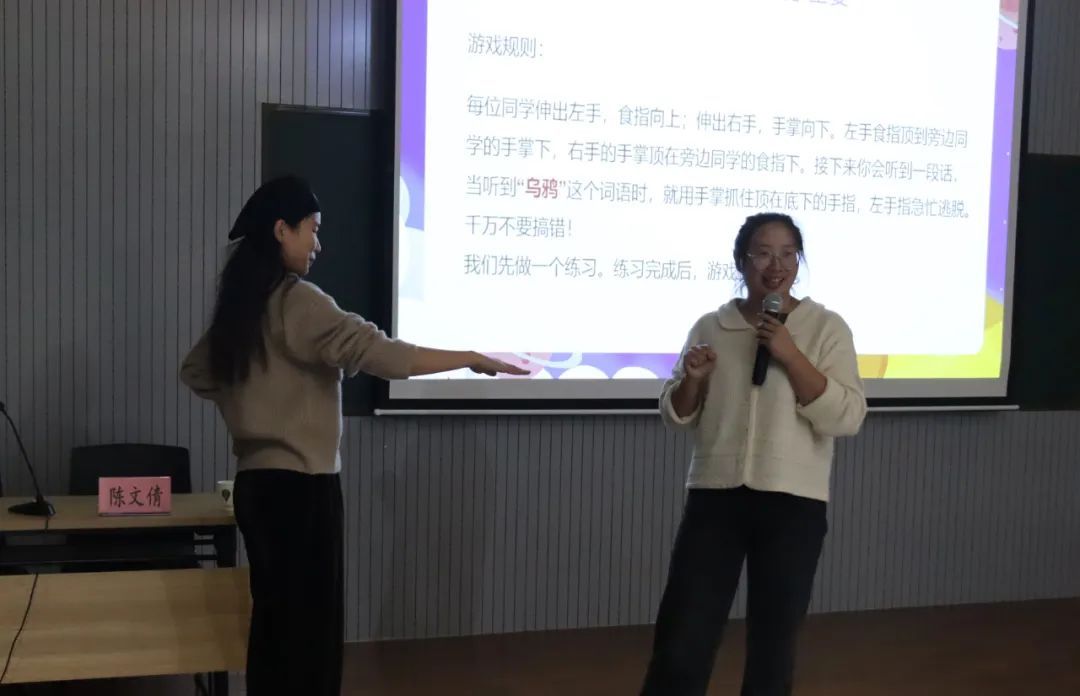 讲座伊始,陈老师通过“我说乌鸦你拍手背”的热身游戏,将现场氛围调动起来,先带领大家无形之中克服了第一波“社交恐惧”。