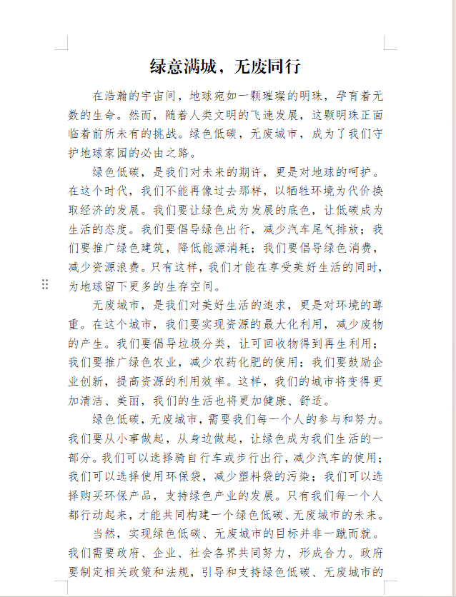 在“绿色低碳,无废城市”征文活动中,参与学生们挥毫泼墨,以文字为媒介,抒发对无废城市的向往和追求。他们结合自己的生活实际,从多个角度阐述了无废城市的重要性以及如何在日常生活中践行绿色低碳理念。这些征文作品不仅文字优美、内容深刻,更富有感染力和号召力,激发了广大师生共建无废城市的热情。