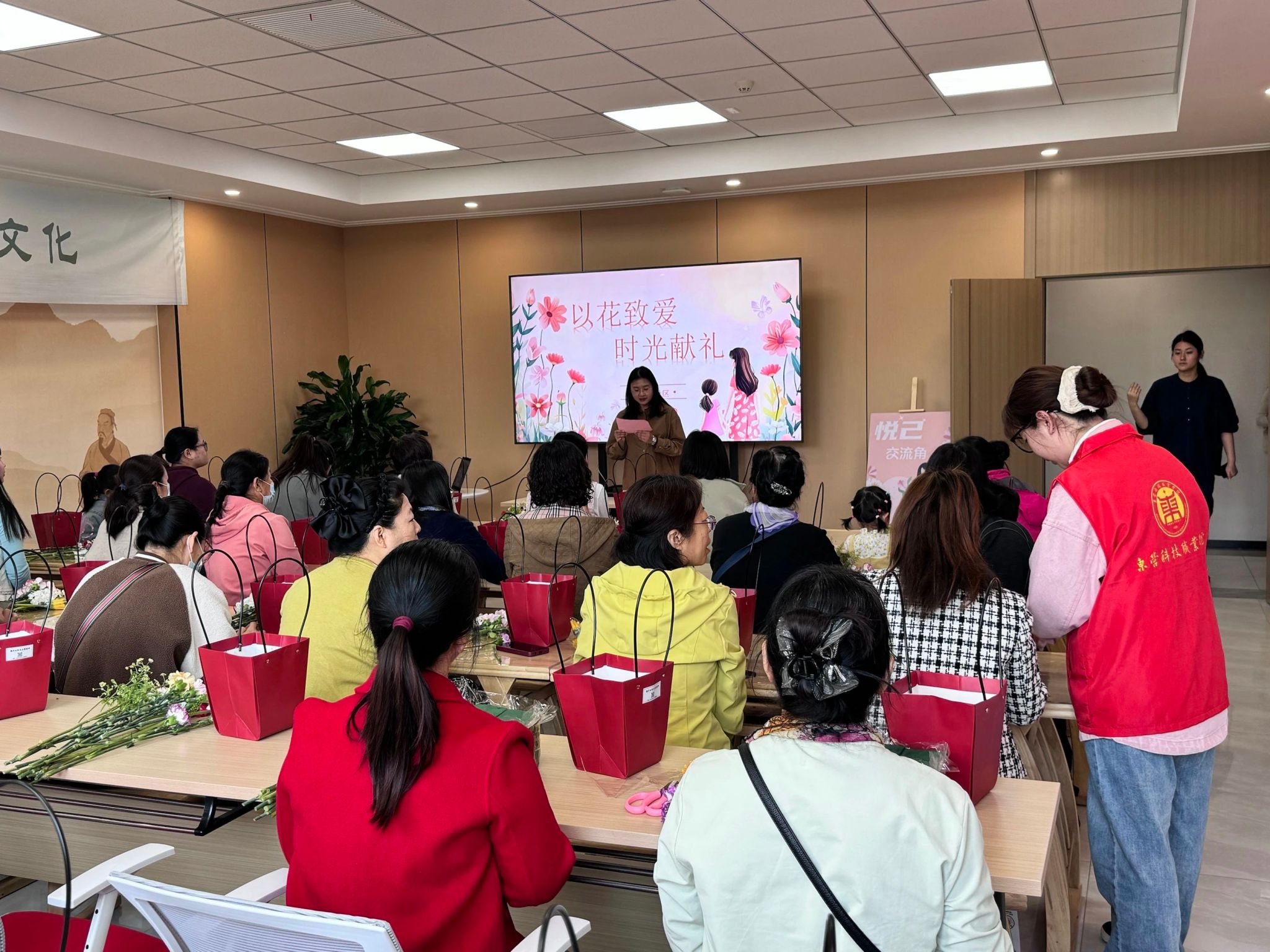 活动现场,志愿者化身“花艺护航员”,提前完成百余支玫瑰、洋桔梗的醒花养护,分装50余套插花工具包,并贴心准备防刺手套等物资。 当50余位母亲落座后,志愿者采用“一对一陪创”模式:协助修剪枝叶、调整花泥高度,,用方言轻声讲解配色技巧,更在母亲们为“玫瑰该斜插还是直立”犹豫时,悄悄托住花泥提供支撑力。康乃馨与郁金香在巧手下渐次绽放,志愿者化身“摄影助手”,蹲身为母亲们抓拍捧花微笑、轻嗅花香的瞬间。