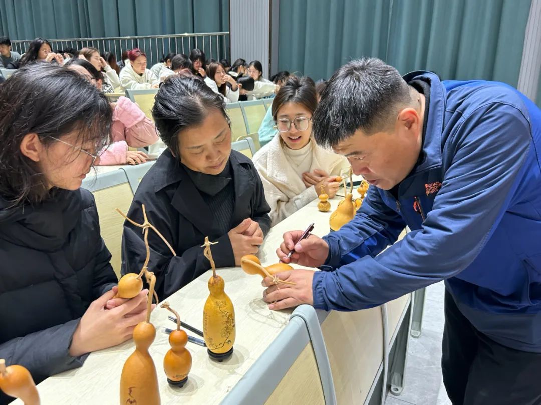 邢文亭老师作为东营市非遗葫芦刻画的代表性传承人,拥有深厚的艺术功底和丰富的创作经验。在讲座中,邢老师详细介绍了葫芦刻画的起源、发展历程以及艺术特点,从国画入手,在葫芦上作画到葫芦篆刻,并现场展示了葫芦刻画的制作技艺。通过邢老师的精彩讲解和演示,师生们不仅领略到了葫芦刻画这一非物质文化遗产的独特魅力,还深刻感受到了中国传统文化的博大精深。