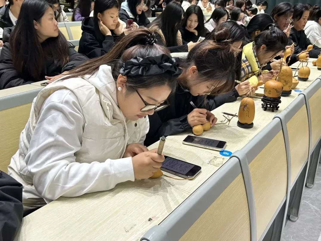 讲座结束前,邢老师带同学们体验了墨刻葫芦,在体验过程中,同学们纷纷拿起刻刀,在葫芦上小心翼翼地刻画出自己心中的图案。有的选择了寓意吉祥的图案,有的则尝试了更加抽象的艺术风格。在邢老师的悉心指导下,同学们逐渐掌握了墨刻葫芦的要领,创作出了一个个独具特色的作品。